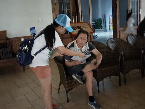 怀着激动的心情,同学们展开了积极的调查。在酒城的各个角落,都能看到同学们在工作的身影。发问卷的同学积极与人沟通,跟拍的同学也东奔西跑,认真仔细的进行着自己的工作。酒城的工作人员,前来买酒的顾客,进行参观的游客都能热情的配合我们的同学进行问卷的填写。