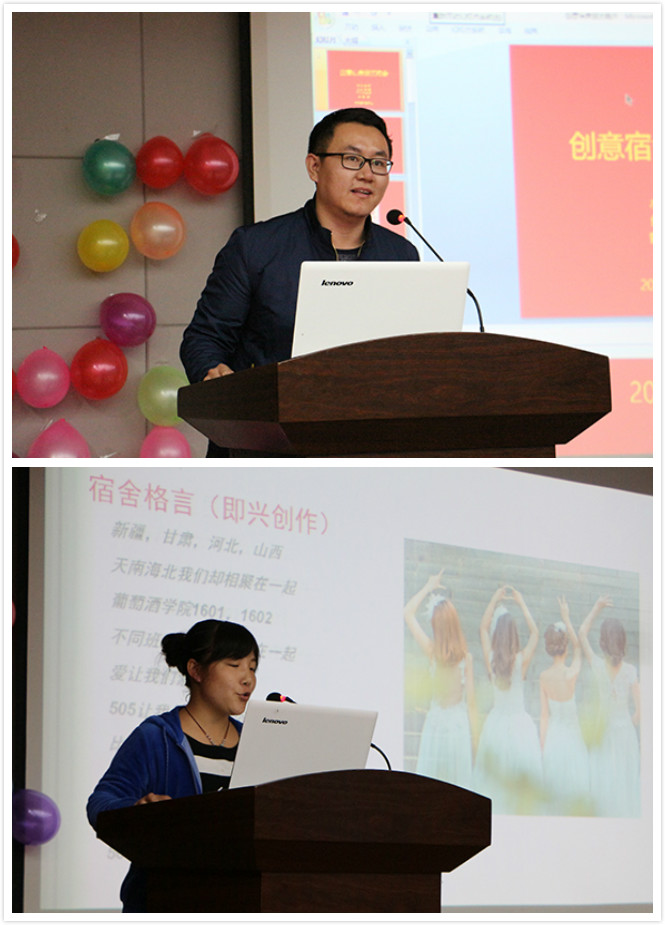 获奖的三个宿舍带来了极具特色的宣讲,获得了场下观众的一致好评。温馨甜美的505宿舍不仅展示了她们复古的地中海风宿舍,更深情朗读了赠给舍友们的情书,并且进行了吉他弹唱的表演,体现了她们多才多艺的一面。个性十足的511宿舍PPT制作精美,讲解员也是饱含深情且不失风趣幽默,宣讲结束后还带来了合唱Counting Stars,场下的观众也都被感染,一起唱了起来。活泼欢乐的518宿舍可爱的宿舍装扮和PPT打动了全场,不仅“春田花花幼儿园”的创意让大家赞叹不已,她们带来的舞蹈更是极富童真童趣,阵阵欢笑在报告厅内回荡。当然,其他学院也进行了创意十足的宣讲,体现了他们的创新精神和团结互助。