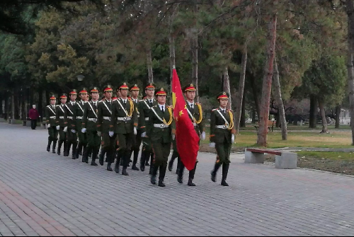 升旗仪式逐渐拉开帷幕,在主持人王若禹的引导声中,大家一起缅怀过去,迎接国旗的到来。伴随着国旗护卫队整齐有力的步伐,鲜红的国旗进入大家的视线。升旗仪式结束后,学生代表进行了国旗下的讲话。之后,由学生代表领誓,同学们面向鲜艳的五星红旗进行了庄严的宣誓: