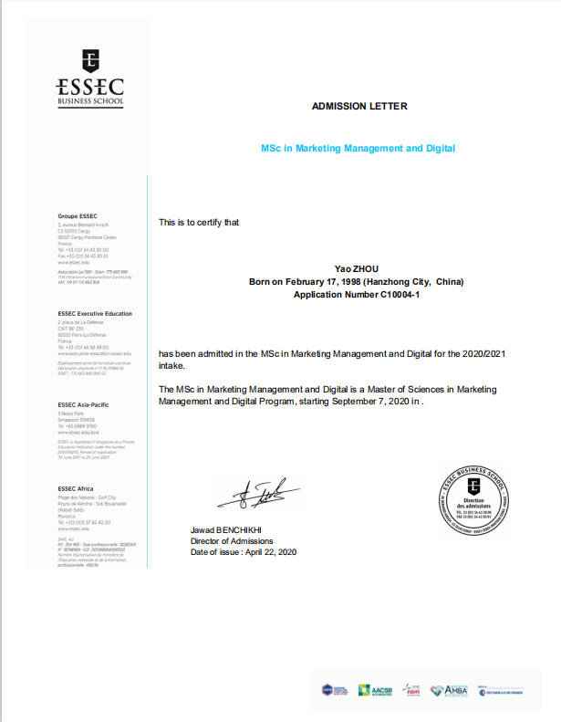 申请ESSEC时除了CV和动机信、推荐信外,还有五个问题需要完成,每个问题相当于一篇小essay,很多人认为这五个问题非常麻烦,但对于我来说,这是向学校展示自己的好机会,因为动机信篇幅有限,无法全面展示自己。我通过这五篇essay,全面展示了自己的实习经历、社团经历、志愿者、职业规划、海外访学经历、以及WSET学习经历(虽然我申请的专业不是葡萄酒,但这个经历可以展示自己的学习能力),并通过这些经历表达自己的能力和品格,告诉学校我就是你们在寻找的候选人。在申请ESSEC时,文书为我带来了很大的优势。