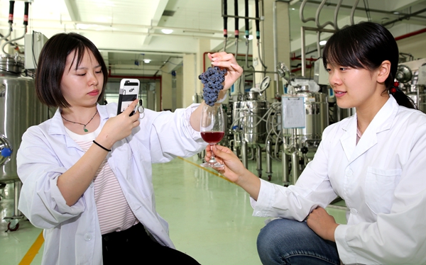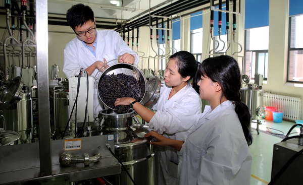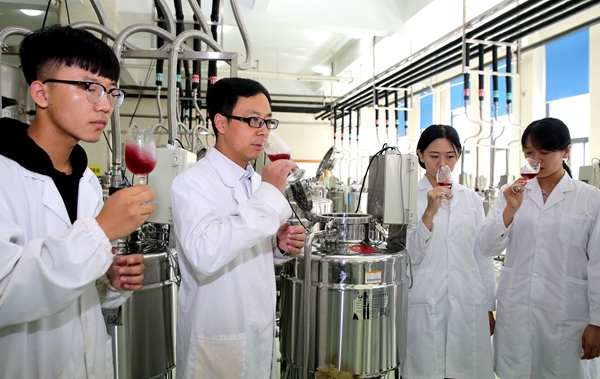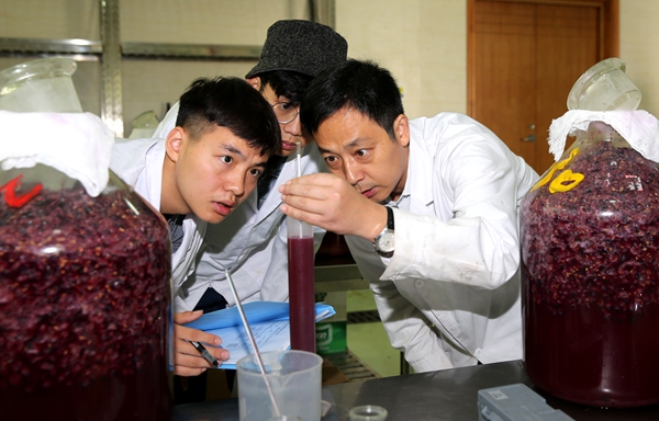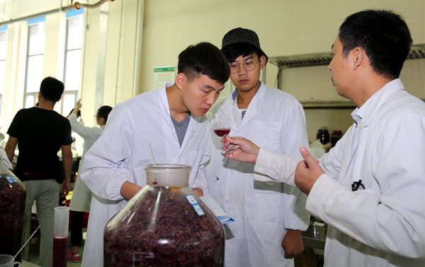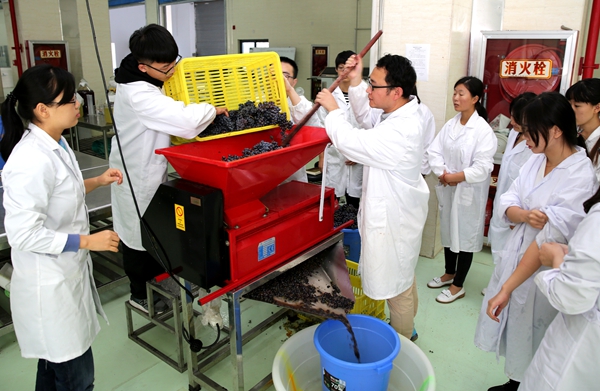 在陶永胜、秦义、宋育阳和靳国杰等老师们的指导下,学生们通过亲手操作掌握葡萄酒酿造的基本技能,独立完成葡萄酒酿造的全过程,独立分析和解决葡萄酒酿造中存在的问题。赤霞珠、梅尔诺、品丽珠、爱格丽、雷司令、霞多丽等人们耳熟能详的葡萄被成筐的采运回学校,在师生们的手里完成华丽的转变:由一串串葡萄变成一罐罐红的、白的、桃红的美酒。
