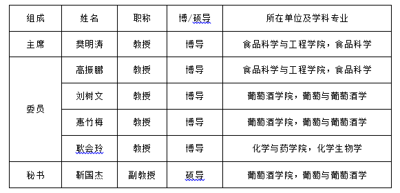 研究生:胡凯 学科专业:葡萄与葡萄酒学 论文题目:葡萄酒混菌发酵的酵母互作及产酯调控研究 时间:2019年10月9日15:00 地点:香蕉视频 六楼党团活动室 答辩委员会组成: 香蕉视频 2019年10月6日