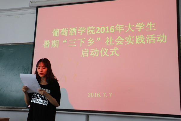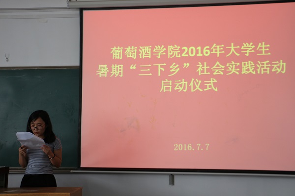 启动仪式上,赵星宇老师介绍了学院暑期“三下乡”社会实践活动的组队情况。本次活动以我院学生为主体、各院学生为补充,学生自发组建了包括葡萄酒产区调研、传统文化实践等十一支团队,其中10支团队获校团委资助立项。在这10支团队中,由我院2014级陆佳玲同学负责、陶永胜教授指导的“贺兰山东麓葡萄酒产业的‘小酒庄,大产区’发展模式调研团队”脱颖而出,在获评校级重点项目立项的基础上,代表我校唯一入选“2016年陕西高校大学生暑期‘一带一路’社会实践项目”,把我院暑期社会实践活动推向了新高度。