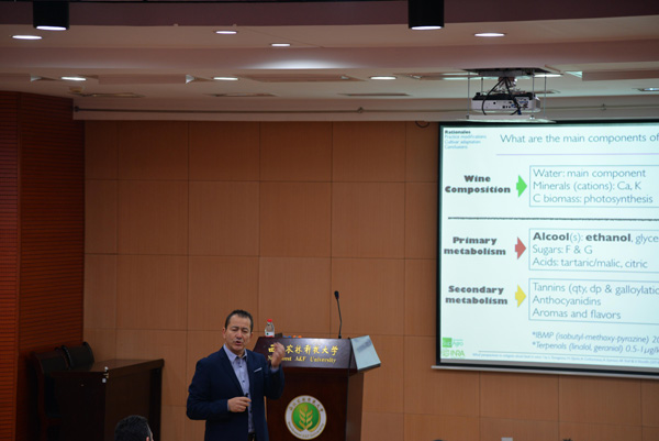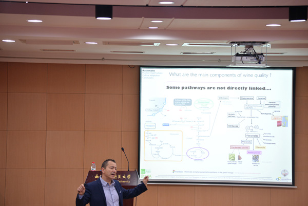 专业基础,思维碰撞。Laurent Torregros先生向同学们做了一场有关“如何在保持葡萄酒的质量的前提下,减少果实中的含糖量”的报告会。Laurent Torregros先生从葡萄酒的成分说起,为同学们讲解了葡萄的初级代谢和次生代谢过程。并提出了两个因素制约糖含量的因素:climate changes、consumers expectations。最后,Laurent Torregros先生从四个方面向大家介绍了如何在减少糖含量的同时保持葡萄酒质量。Laurent Torregros先生强调:葡萄酒行业的人才必须要掌握扎实的理论基础,深刻挖掘葡萄酒背后的科学知识,努力提高理论水平,成为带领行业发展的技术骨干。