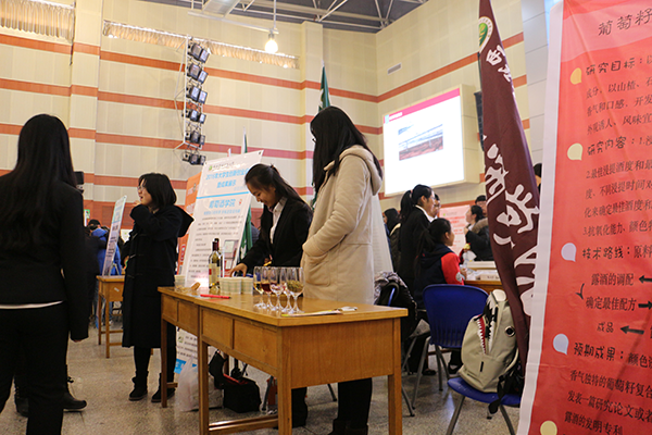 与学院特色展板一同展出的还有两项科创项目,它们分别是基于底物压力的共轭亚油酸(CLA)生产菌的筛选与鉴定以及葡萄籽复合露酒的开发。这两项科研项目凝聚了我院师生的创意和心血。充分地展现了我院在创新创业领域取得的突破性进展。