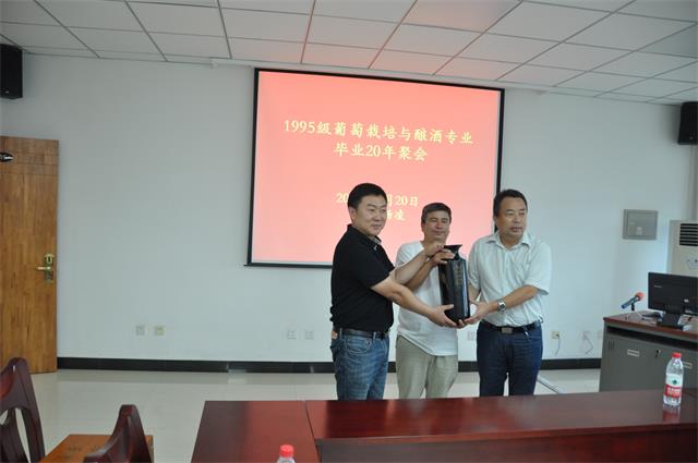 校友们翻阅了学校校友会送上的《校友通讯》,介绍了各自毕业后的事业、家庭状况,并同当年的辅导员惠竹梅、杨和财及任课老师代表振文、刘延琳等老师一起,共叙当年在校时的愉快往事,追忆老师们的教诲之恩。校友们还为学院送上了精心准备的刻有该班全体学生姓名的孔子塑像,寓意学院对葡萄酒教育事业的卓越贡献。