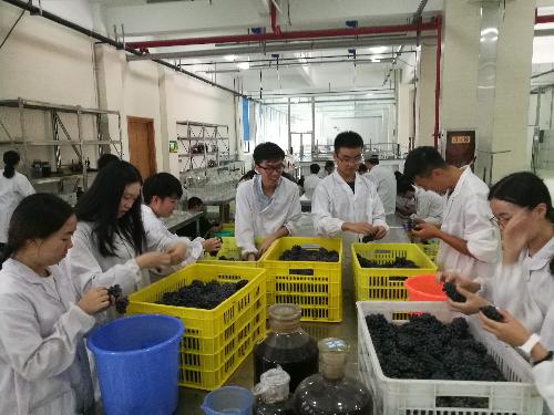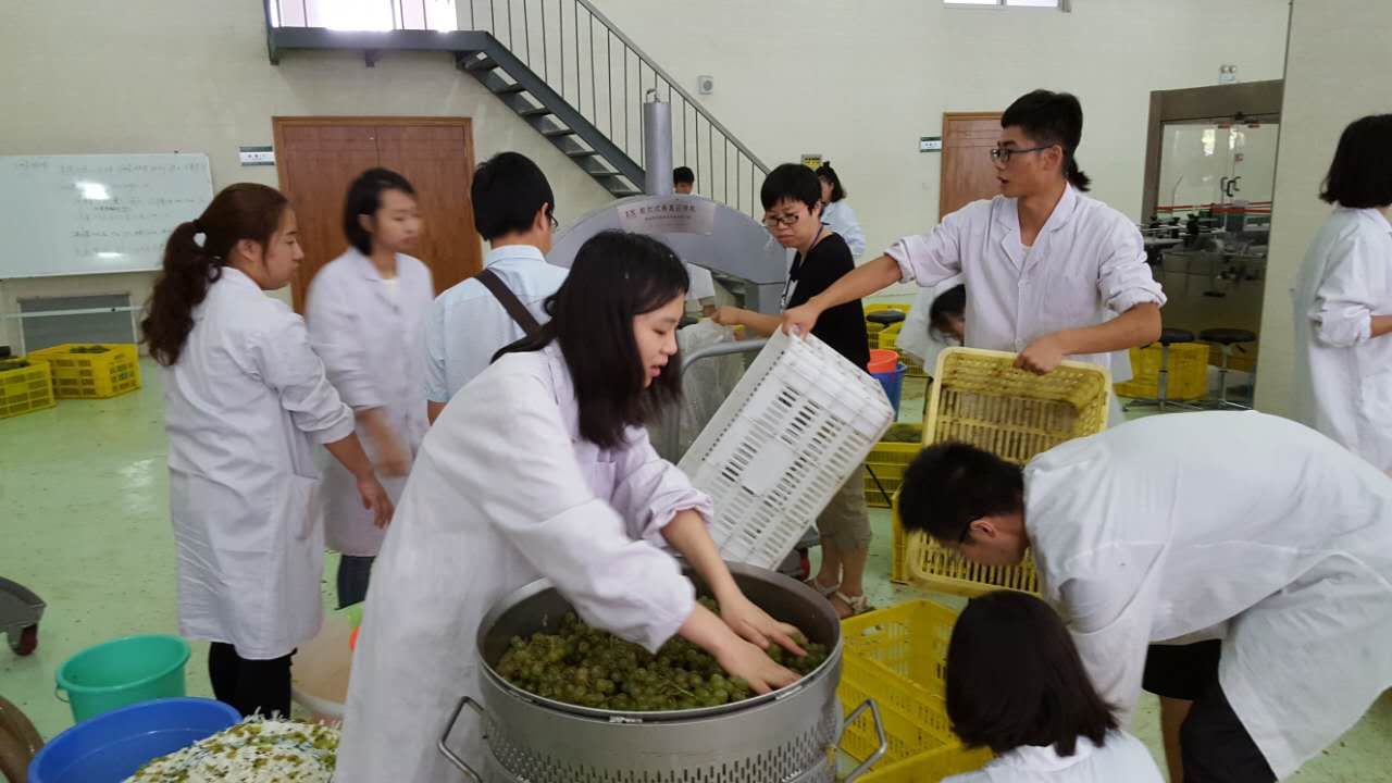 在葡萄酒酿造过程中,同学们不怕辛苦、任劳任怨,在中试规模上,对9个红、白酿酒葡萄品种,进行了分拣、原料成分分析、破碎除梗、发酵监控、澄清、压榨、发酵罐维护等操作,依据葡萄品种差异,出色地制定并完成了各具特色的酿造工艺。