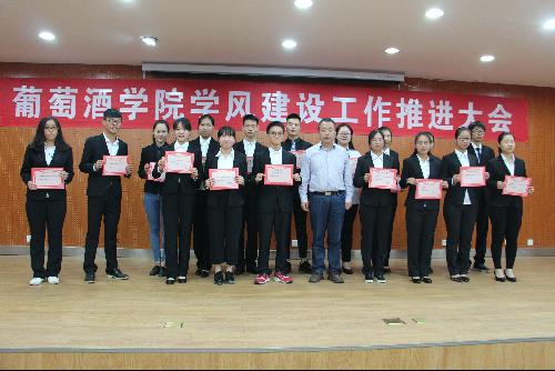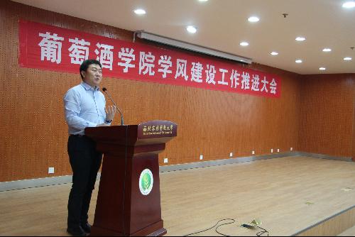 关于进一步加强学风建设工作的实施办法》,分别从学院层面、教师层面和学生层面围绕教风和学风提出了多项措施,并从加强师德师风建设、完善质量监控、强化激励约束机制三个方面提出具体要求。陶永胜教授代表教师发言,陶教授从自身授课经历出发,进行反思和总结,对学院教师教学风貌提出希望和要求。陶老师指出教师要谨记职责和任务,严谨教风,教书育人,为行业培养真正的人才,为社会教育出合格的接班人。1601班荆思雨代表学院全体学生做出承诺,要严格遵守学习纪律,践行优良学风,展现葡酒学子良好的学习风貌。刘树文副院长宣读“香蕉视频