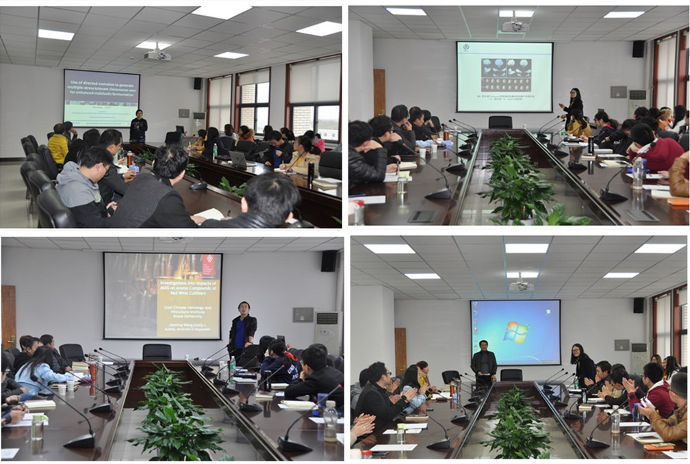 随后,姜娇、王家明、高金珊三位青年英才代表为我院师生带来了精彩纷呈的学术报告。首先,姜娇讲了题为“Use of directed evolution to generate multiple-stress tolerant Oenococcus oeni for enhanced malolactic fermentation”的报告,她围绕实验背景、目的、方法、结果等方面进行了详细的介绍,对未来的研究方向提出了建议。王家明着重介绍了其参与建设的数学模型估测葡萄采收期和价格的体系,并表示对我国宁夏产区建设相应体系的抱有很大希冀。最后,高金珊围绕“大豆类胡萝卜素裂解基因GmCCD4的克隆及功能分析”进行了简单汇报,介绍了通过分子水平的研究生产处大豆新品种的方法,并与参会师生探讨了通过基因水平改造葡萄,生产葡萄新品种的可能性。