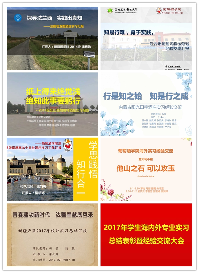 副院长刘树文在总结2017年葡萄酒工厂生产实习工作中指出,学院以学生为中心构建了覆盖“从土地到餐桌”所有环节的实践教学运行体系,在国内外建立40余个教学实践基地,全面支撑了具有国际就业能力培养的人才发展模式。2017年共有130名学生参加海内外专业实习,其中22人赴海外实习创历史新高,学生足迹遍布国内外主要葡萄酒产区,包括法国、意大利以及新疆、内蒙古、宁夏、山西、北京五省。