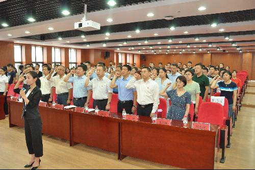表彰大会在雄壮的国歌声中拉开帷幕。学院党委副书记邓亚丽同志带领预备党员面向党旗庄严宣誓,正式党员重温了入党誓词。