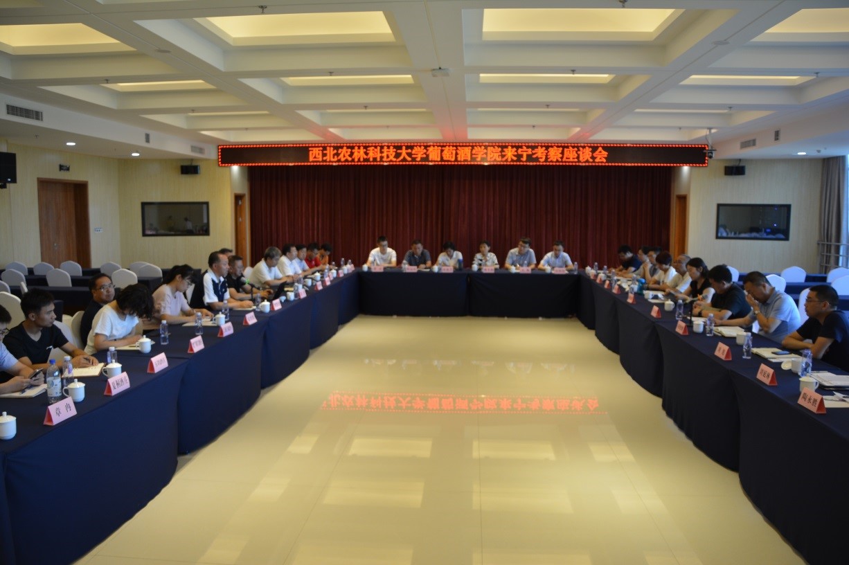 领导就宁夏贺兰山东麓产区葡萄酒产业进行了深入交流。曹凯龙局长介绍了宁夏葡萄酒产业发展情况和下一步的规划,徐军副局长介绍了产区近期开展的重点工作。学院胡俊鹏书记简要介绍了学校、学院的情况,并就高层次人才交流机制、科学研究、产区建设等方面提出了合作设想,房玉林院长就学院与产区的合作进展、取得的成绩,以及下一步的合作框架等进行了交流。双方领导共同认为高校与产区职能部门及企业应携手并进、协同发展,努力推进宁夏葡萄酒产业环保、经济、可持续的发展,致力于开创具有中国葡萄酒特色的发展之路。