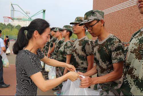 党委书记胡俊鹏、院长房玉林和党委副书记邓亚丽在辅导员的带领下来到训练场地,亲切的慰问了我院参加军训的2018级全体学生和教官。