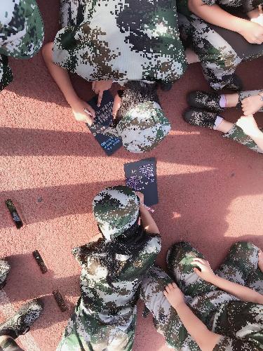 训练间隙我们趴在田径场给轩轩教官准备一份惊喜的礼物