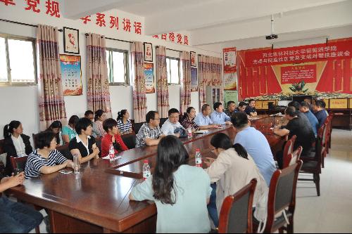 在坊镇街道社区,学院党委书记胡俊鹏带领领导班子及师生党员代表,与坊镇相关领导及坊镇街道社区党总支党员共同面向党旗,开展了坚定庄严有力的宣誓。座谈期间,胡俊鹏表示:开展此次“不忘初心、牢记使命”主题教育党日实践活动,是学院领导班子、各支部书记及师生党员代表深入试验站、葡萄产业生产一线实践调研学习交流的一次重要活动,让每一位党员的思想得到进一步提升,体会学院办院的初心,深刻理解学院承担的使命任务,发挥学院人才技术优势,依靠科学技术和智力资源,带动合阳葡萄与葡萄酒产业发展,帮助乡亲们日子把过得更好,为合阳乡村振兴和农村脱贫致富舔砖加瓦;胡俊鹏指出,学院进一步加强力度,积极探索党建帮扶措施,开展学院党委与党支部和坊镇社区党总支与贫困户“一对一、五帮扶”的技术、物资、消费、人才智力以及示范引领等多种党建扶贫形式。香蕉视频