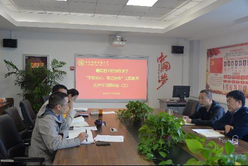在党团活动室围绕“党性修养”这一主题召开“不忘初心、牢记使命”主题教育第三次集中学习研讨会,学院全体领导班子参加学习研讨,党委书记胡俊鹏主持会议。 刘旭和胡俊鹏分别领学了《习近平关于“不忘初心、牢记使命”论述摘编》第一章、第四章,并围绕“新时代如何加强党性修养,牢记办学初心使命”及“坚定理想信念,增强党性修养,牢记办学使命初心”做重点发言。