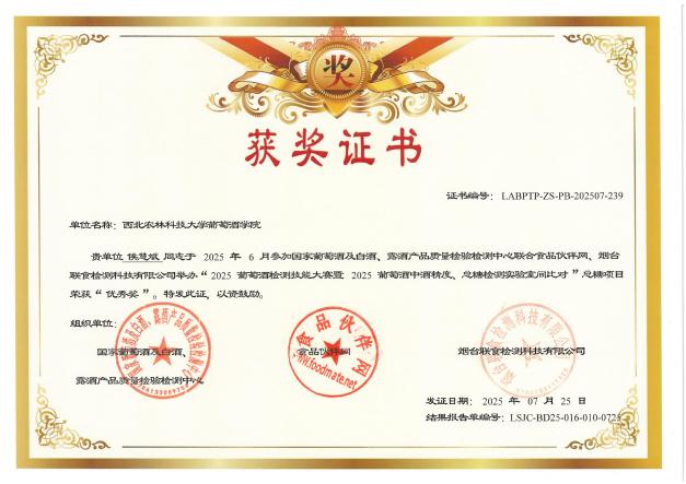 近日,"2025葡萄酒检测技能大赛暨2025葡萄酒中酒精度、总糖检测实验室间比对"活动圆满落幕。学院本科生刘亚莉、侯慧斌、黄佳文三位同学获个人奖项,学院《葡萄酒分析检验》课程组获“优秀组织奖”。